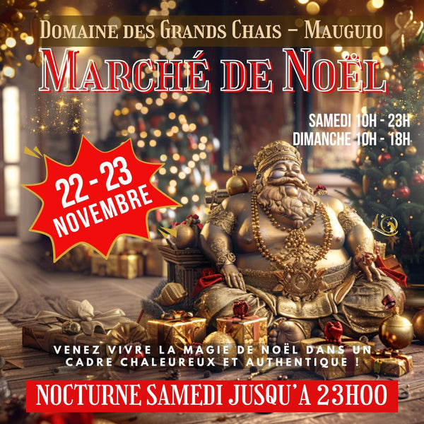 Je suis ravi(e) de vous annoncer ma présence au Marché de Noël qui se tiendra au Domaine des Grands Chais à Mauguio les 22 et 23 novembre.